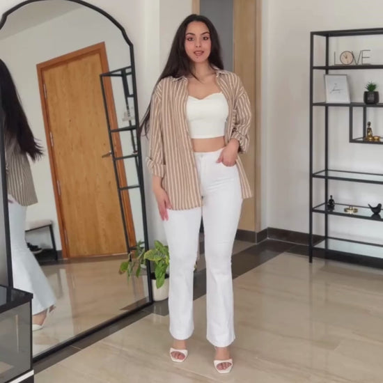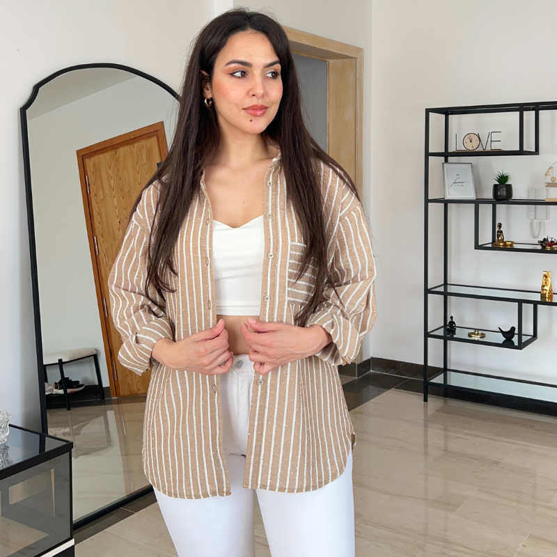 Élégance naturelle et éclat discret s’unissent dans la chemise Lina. Confectionnée en lin léger à rayures subtiles, cette pièce respire la fraîcheur estivale tout en capturant la lumière grâce à ses délicats strass incrustés. Parfaite pour un look à la fois raffiné et décontracté, elle se porte aussi bien rentrée dans un pantalon taille haute qu’ouverte sur un top fluide. Une touche de brillance qui rehausse l’essence du lin.