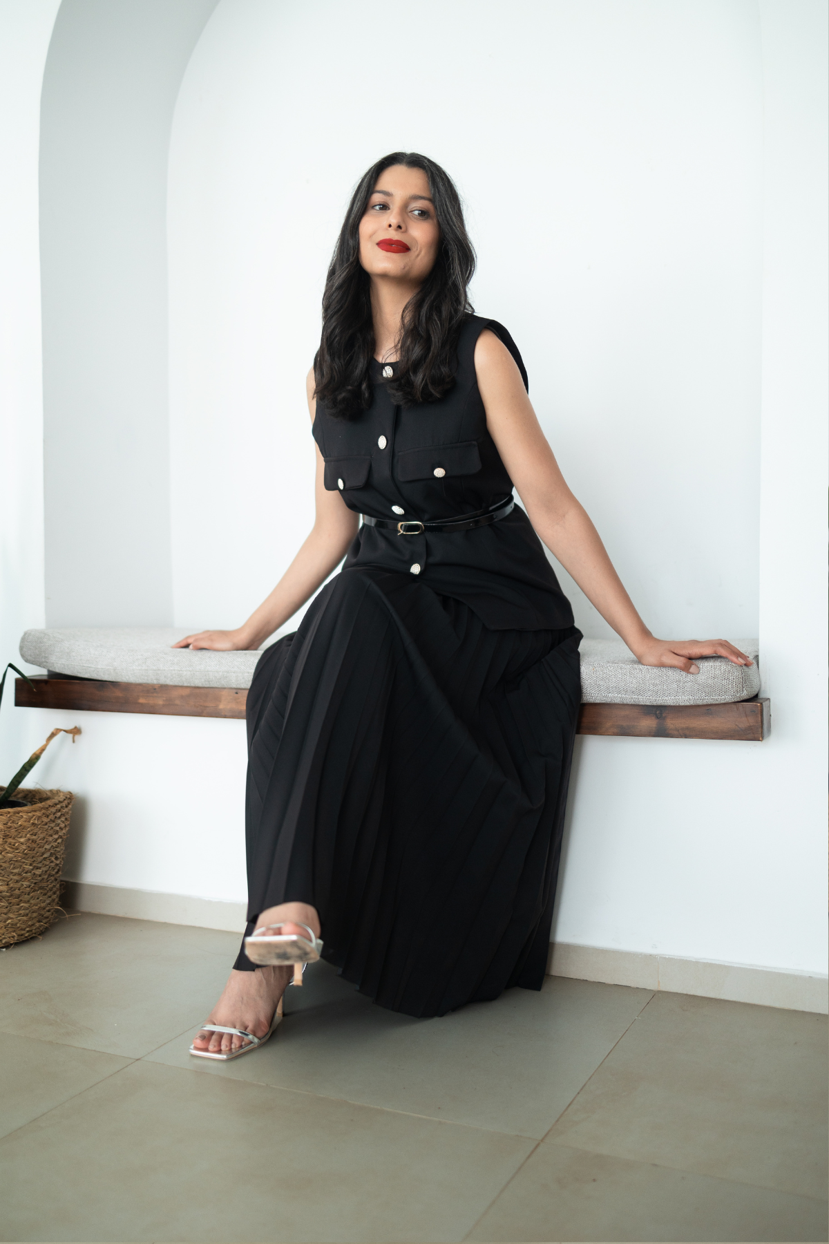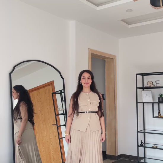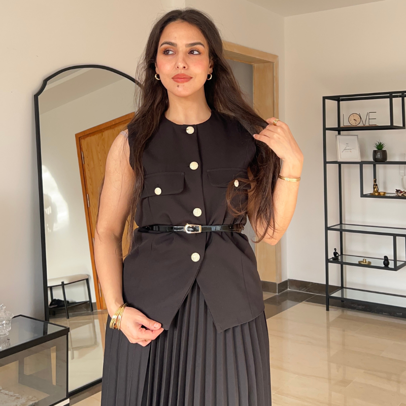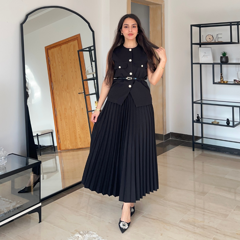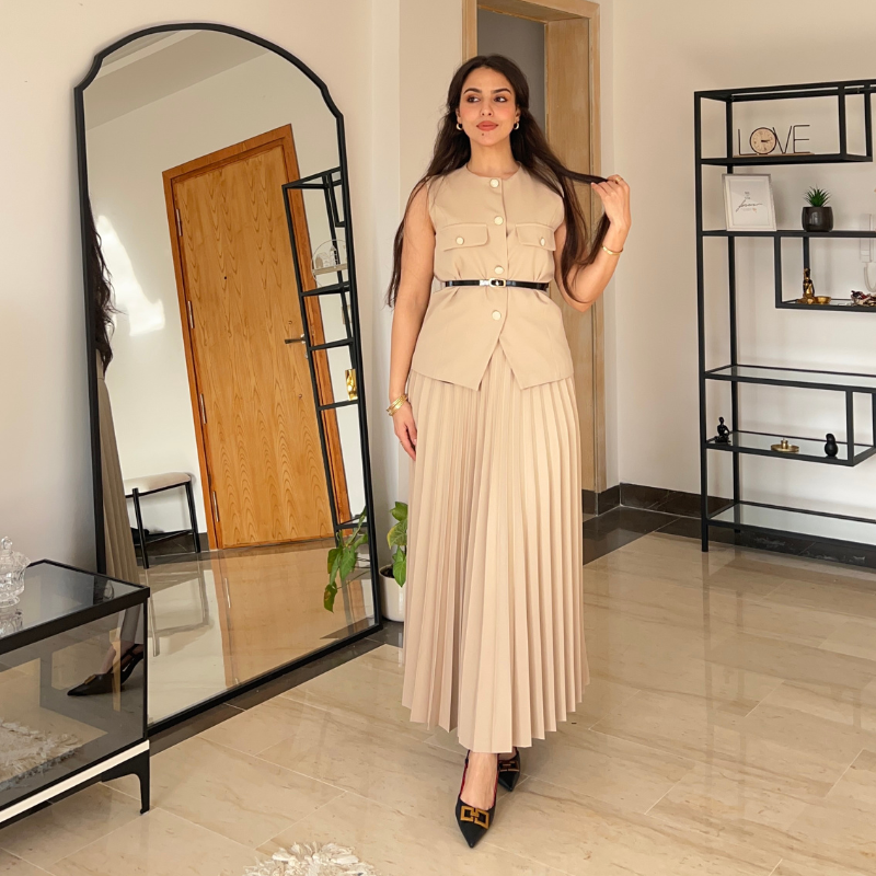 Composé d’une veste sans manches ceinturée et d’une jupe plissée fluide, ce duo sublime la silhouette avec légèreté et assurance.