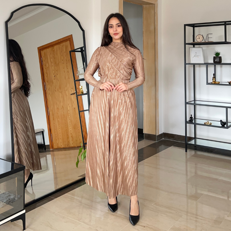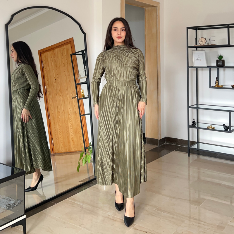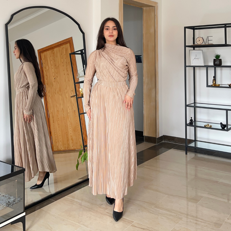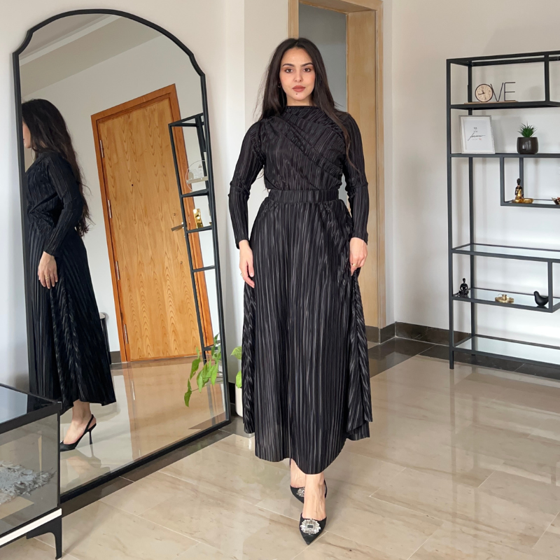Nora, c’est l’accord parfait entre un body qui épouse le corps sans serrer, et une jupe plissée qui danse à chaque pas. Un look complet, raffiné mais simple.